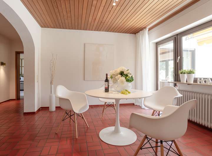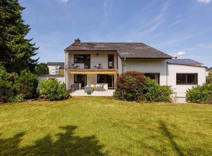 Über den einladenden Eingangsbereich und den angrenzenden Flur mit integrierter Garderobe gelangen Sie direkt in das freundliche Esszimmer mit Zugang zur sonnigen Terrasse. Die angrenzende, funktionale Einbauküche überzeugt mit kurzen Wegen und viel Stauraum. Ein zusätzliches, flexibel nutzbares Zimmer rundet diesen Bereich ideal ab. Ein Gäste-WC mit Dusche sowie ein weiteres, lichtdurchflutetes Arbeitszimmer bieten zusätzlichen Komfort im Erdgeschoss. Das Herzstück des Hauses bildet das großzügige, behagliche Wohnzimmer mit bodentiefen Fensterelementen. Von hier aus haben Sie direkten Zugang zur sonnigen Terrasse – ein perfekter Ort für entspannte Stunden. Der angrenzende, weitläufige Garten begeistert mit einem herrlichen alten Baumbestand, einem Gartenhaus und viel Platz für Spiel, Erholung oder gärtnerische Ideen. Ein weiteres Highlight: der direkte Zugang zum angrenzenden Feld und Naturschutzgebiet – ideal für Naturliebhaber oder aktive Familien.