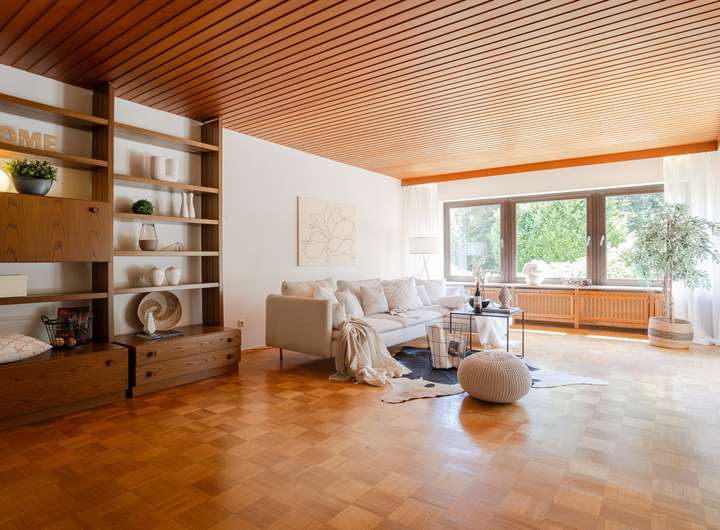 In ruhiger Feldrandlage, unmittelbar angrenzend an ein Naturschutzgebiet, bietet dieses sanierungsbedürftige Haus aus dem Jahr 1971 auf einem ca. 1.028 m² großen, liebevoll bewachsenen Grundstück ein enormes Potenzial für Familien mit individuellen Gestaltungsmöglichkeiten. Mit einer Wohnfläche von ca. 156 m² verteilt auf sieben gut geschnittene Zimmer bietet das Haupthaus ausreichend Platz.