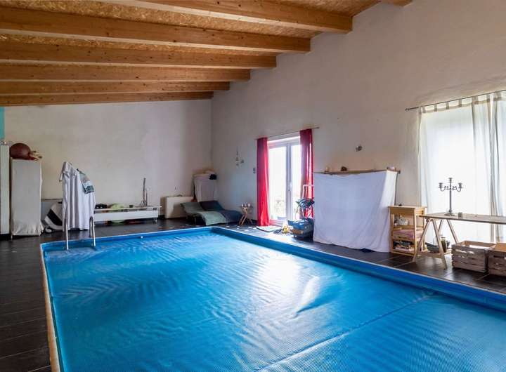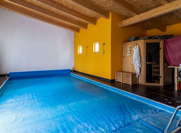 Wellnessbereich: Beheizter Innen-Pool (2024 renoviert) mit Gegenstromanlage und angrenzender gemütlicher Sauna