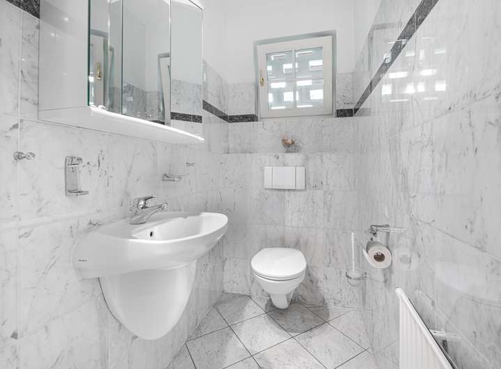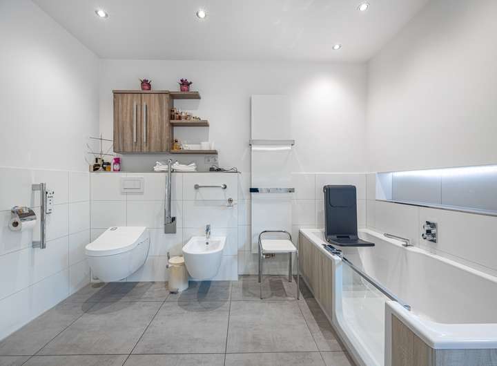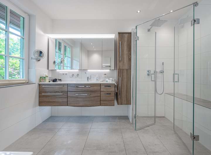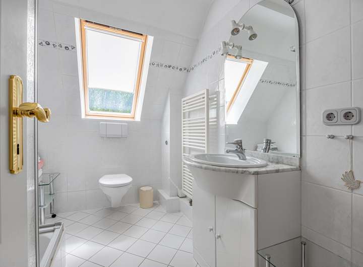 Die Villa verfügt über drei helle Badezimmer, die Komfort und Funktionalität auf harmonische Weise vereinen. Besonders hervorzuheben ist das modernisierte Bad im Erdgeschoss, das 2019 mit viel Liebe zum Detail und einem Sinn für zeitgemäßes Design erneuert wurde. Großzügige, lichtdurchflutete Räume schaffen ein Wohngefühl, das inspiriert und entspannt. Für behagliche Wärme sorgt eine moderne Öl-Zentralheizung (erneuert 2016), während eine Entkalkungsanlage die technische Infrastruktur dauerhaft schützt und erhält.
