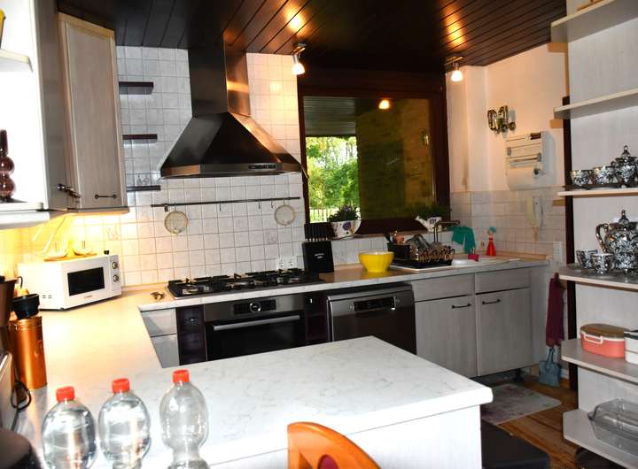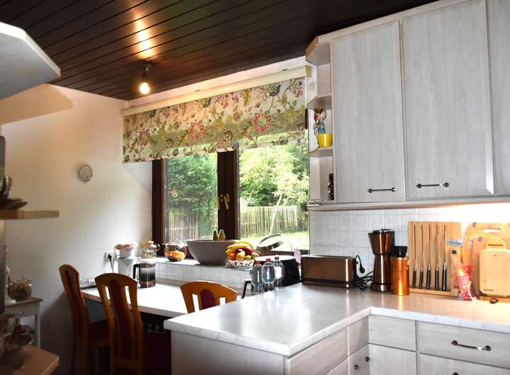 Im Erdgeschoss erwarten Sie helle, freundliche Räume: eine Küche mit Platz für gemeinsame Kochmomente, ein gemütliches Esszimmer und ein großzügiges Wohnzimmer mit Kamin, das zum Entspannen einlädt. Der Natursteinboden, die Fußbodenheizung und die Holzfenster mit Zweifachverglasung sorgen für ein angenehm warmes Wohngefühl.