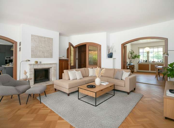Das große Wohnzimmer mit Kamin schafft eine angenehme Atmosphäre für ruhige Abende. Die angrenzende Bibliothek, derzeit als Esszimmer genutzt, bietet Platz für größere Runden oder kann flexibel umgestaltet werden.