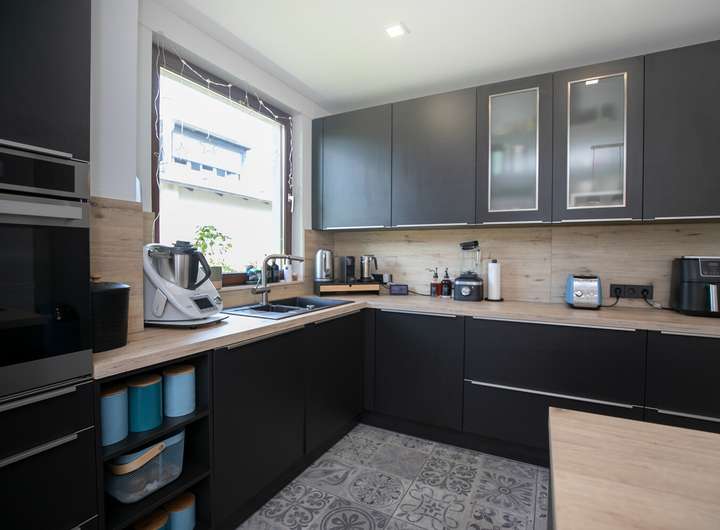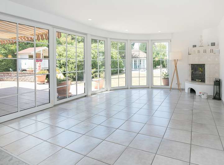 Der helle Wintergarten, Anfang der 1990er Jahre angebaut, bildet das Herzstück des Hauses. Zusammen mit der offenen Küche entsteht hier ein Raum, der den Alltag verbindet – ob beim gemeinsamen Essen, Lernen oder Entspannen mit Blick in den Garten. Von hier aus führt der direkte Zugang auf die Terrasse, die sich ideal für Mahlzeiten im Freien oder gesellige Runden eignet.