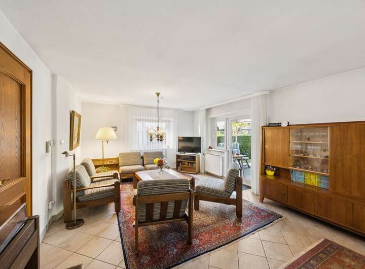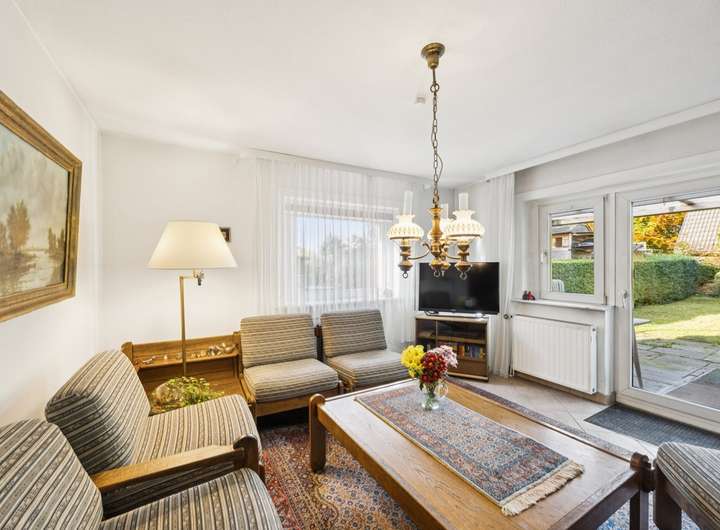Mit einer Wohnfläche von ca. 131,65m² und einer klassischen Raumaufteilung überzeugt das Haus durch ein großzügiges Platzangebot. Im Erdgeschoss befinden sich drei gut geschnittene Zimmer, eine Küche, ein Badezimmer sowie der Zugang zur überdachten Terrasse mit nördlicher Ausrichtung – ideal für entspannte Stunden an warmen Tagen. Von hier aus gelangen Sie in den uneinsehbaren Garten.