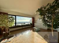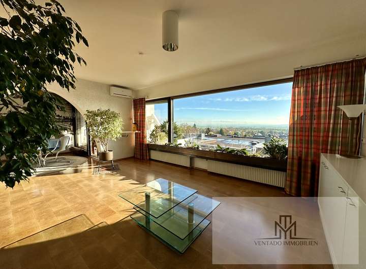 Großzügiger Wohn- und Essbereich mit eindrucksvollem Panoramafenster und herrlichem Fernblick