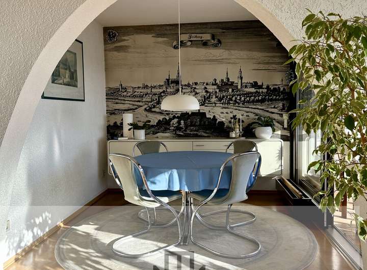 Das Herzstück des Hauses bildet der weitläufige Wohn- und Essbereich mit dem großen Panoramafenster (erneuert 2013), das den Blick über die Wetterau öffnet und den Raum in warmes Licht taucht.