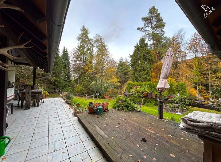 Das parkähnlich angelegte Grundstück mit drei Naturteichen, zwei Brunnen und einer eigenen Quelle bietet ein außergewöhnlich naturnahes Umfeld. Die Teiche eignen sich zum Schwimmen, Fischen oder einfach zum Genießen der Ruhe. Optional kann ein angrenzendes Waldstück mit einer kleinen Blockhütte übernommen werden.