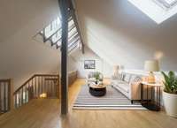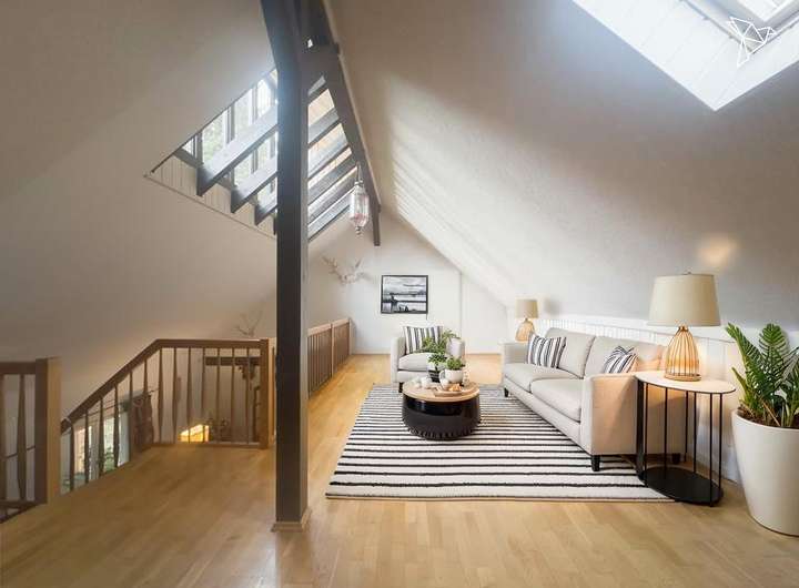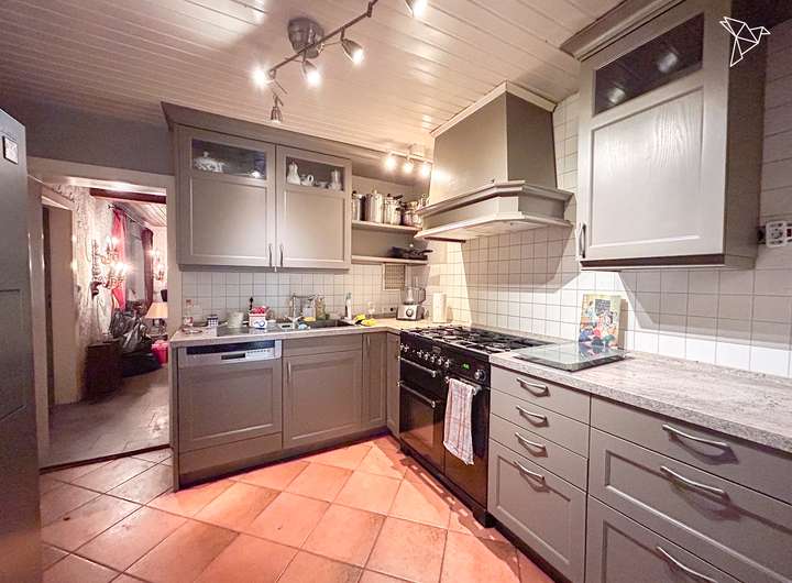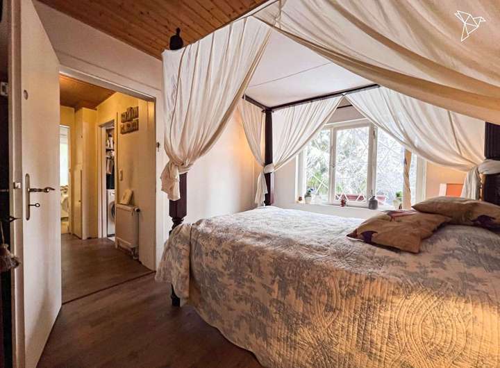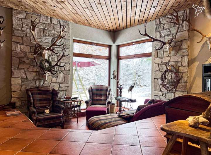 Im Mittelpunkt steht der großzügige Wohn- und Essbereich mit Kamin und direktem Aufgang zur offenen Galerie. Die fünf abgeschlossenen Zimmer lassen sich flexibel als Schlaf-, Kinder- oder Arbeitsräume nutzen. Zwei sanierte Bäder sowie eine einladende Landhausküche mit Frühstücksecke und bodentiefen Fenstern, die den Blick in den Garten öffnen, schaffen eine warme, wohnliche Atmosphäre. Besonders reizvoll ist die Galerie mit ihrem großen Oberlicht, die zu entspannten Stunden einlädt. Auch das Jagdzimmer mit Eckfenster und Holzofen sorgt in der kalten Jahreszeit für gemütliche Momente.