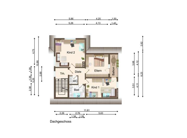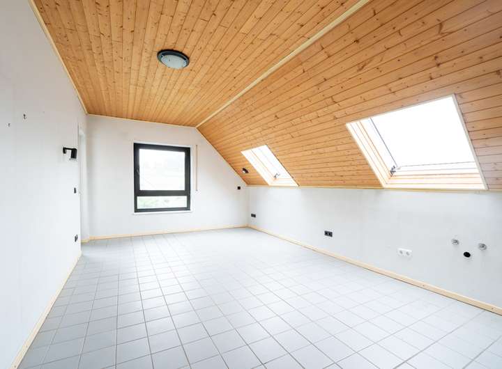 Das Dachgeschoss bietet reichlich Platz für die ganze Familie. Zwei Kinder- und Jugendzimmer schaffen Raum zum Spielen, Lernen und Entfalten. Das Elternschlafzimmer mit eigenem Balkonzugang lädt zu entspannten Stunden ein. Ein großzügiges Badezimmer rundet diese Etage ab.
