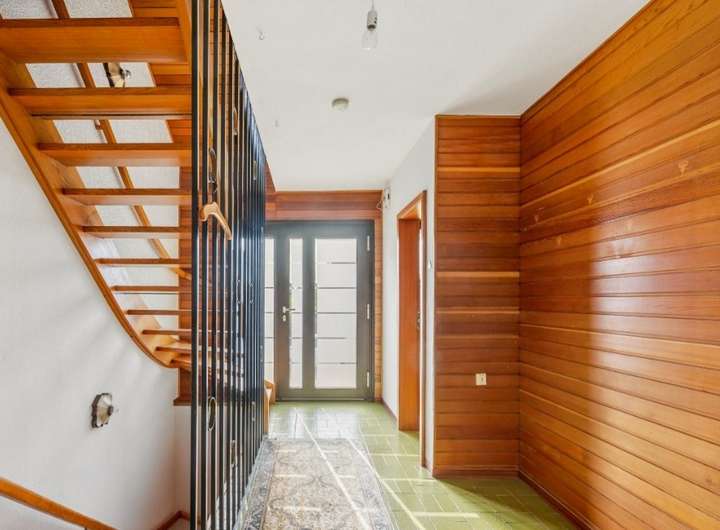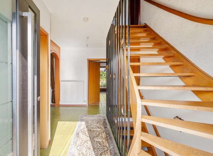Leicht zurückversetzt durch einen mit Zierpflanzen begrünten Vorgarten gelangt man über eine achtstufige Treppe zum Hauseingangsbereich mit Südausrichtung in das lichtdurchflutete Entree des charmanten Einfamilienhauses.
