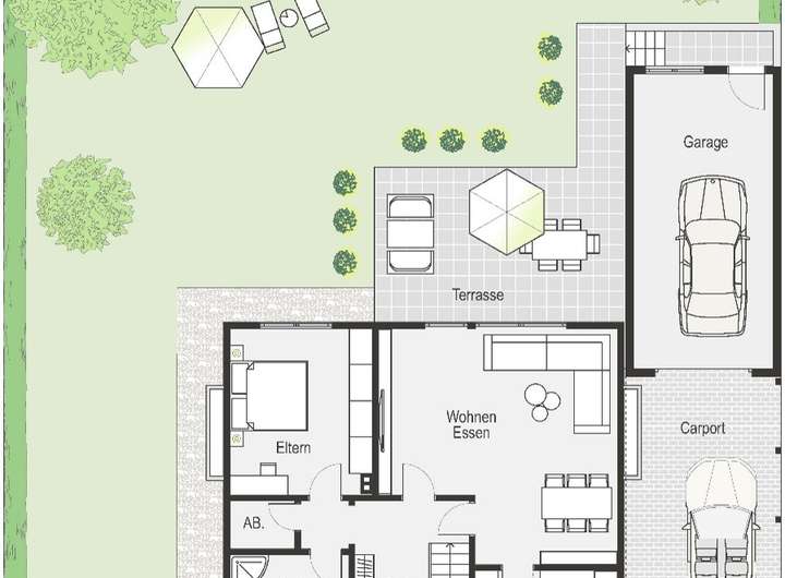 Die geräumige Garage und der davorliegende Außenstellplatz sorgen für bequemes und sicheres Parken. Die Garage ist zusätzlich vom Gartenbereich aus erreichbar.