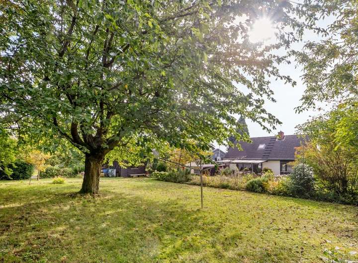 Zahlreiche Bäume mit Charakter, Zierbäume, blühende Stauden und Sträucher sorgen für ein prächtiges Farbenspiel im Wechsel der Jahreszeiten, Obstbäume mit herrlichen alten Obstsorten und zahlreiche Beerensträucher laden zum Genießen ein. Ein großer Kirschbaum im hinteren Teil des Gartens lädt zum schattigen Verweilen in absoluter Ruhe ein.