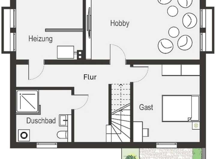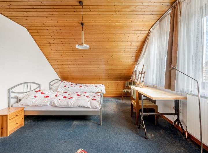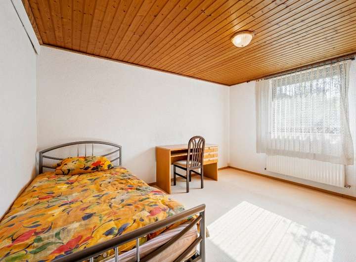 Im Souterrain findet sich Platz für einen großen Hobbyraum, ein Gäste-Zimmer sowie ein weiteres Duschbad, alle Räume mit Fenster und Holzdecken.