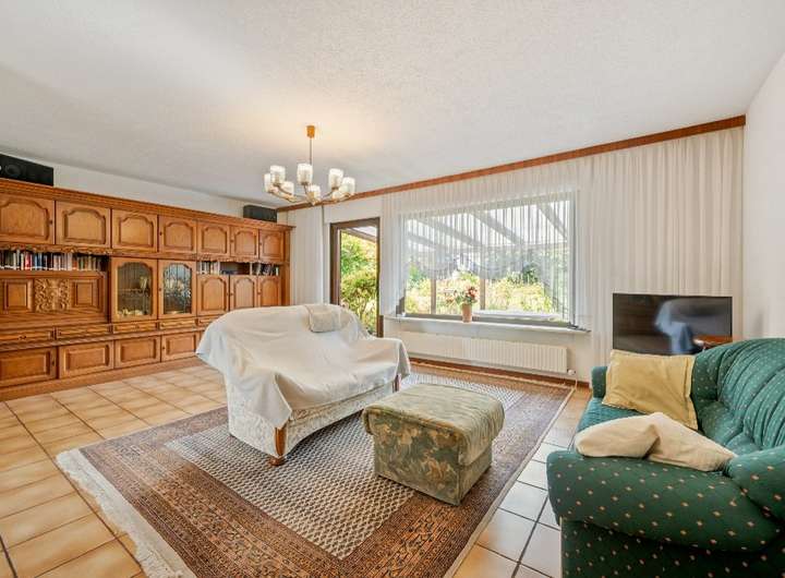 Der großzügige Wohn-Essbereich mit großer Fensterfront und Zugang auf die geräumige überdachte Terrasse bietet einen herrlichen Blick in den großen Garten.