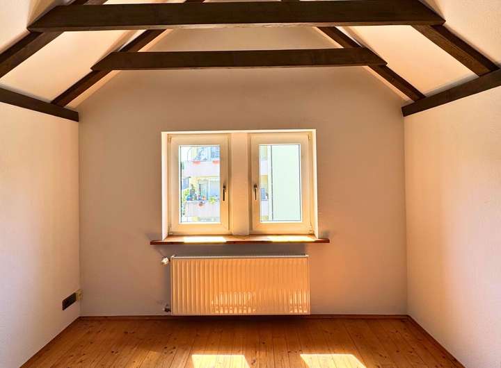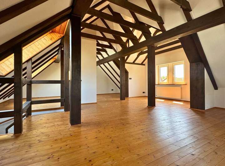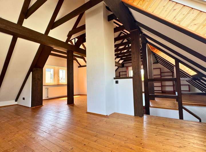 Über die Treppe gelangen Sie ins offene Dachgeschoss, das mit 37 m² Wohnfläche beeindruckt. Dieser Raum ist perfekt für einen großen Esstisch, einen gemütlichen Wohnbereich sowie bei Bedarf für einen lichtdurchfluteten Arbeitsplatz. Alternativ lassen sich auch hier Schlafzimmer einrichten, wenn der untere Bereich als Wohn- und Essbereich genutzt werden soll.