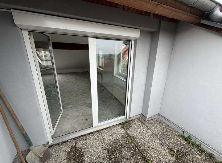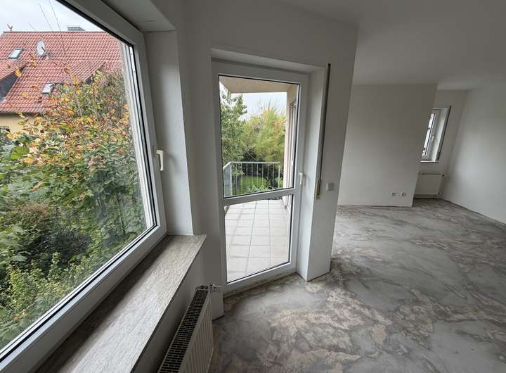 - Das eine Zimmer ("Schlafen 1", Zusammenlegung der Räume "Kind 1" und "Kind 2") hat praktischerweise ein angeschlossenes Ankleidezimmer. Von diesem Zimmer hat man durch das breite, bodentiefe Fenster einen ungehinderten Blick auf den Garten und durch die Tür den Zugang auf den in Süd-West-Ausrichtung gelegenen Balkon.