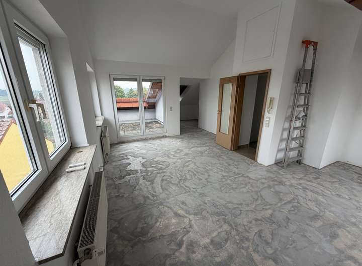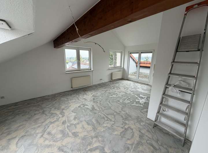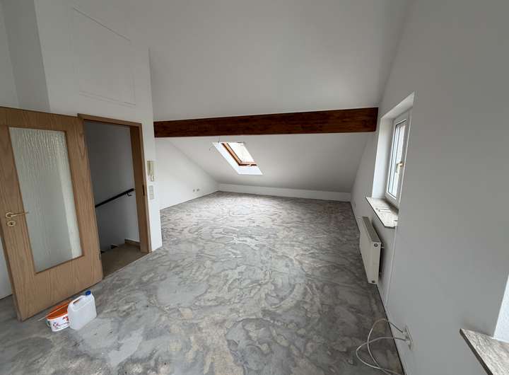 Auch im großen Dachstudio wurde der alte Teppichboden entfernt und der Untergrund für einen neuen Bodenbelag vorbereitet.