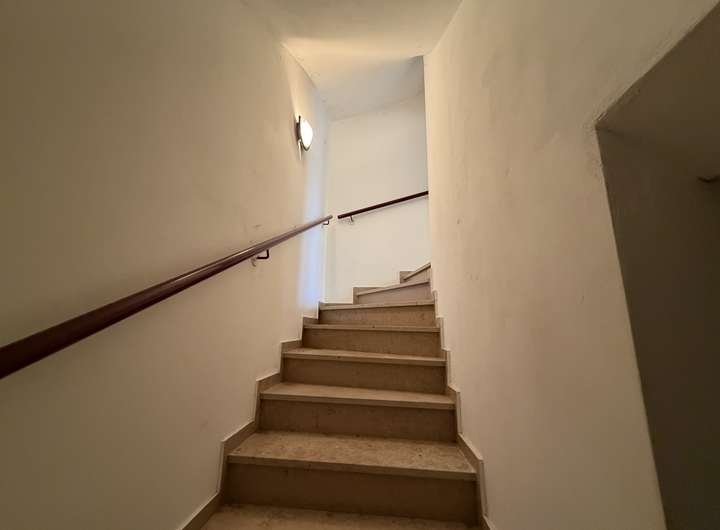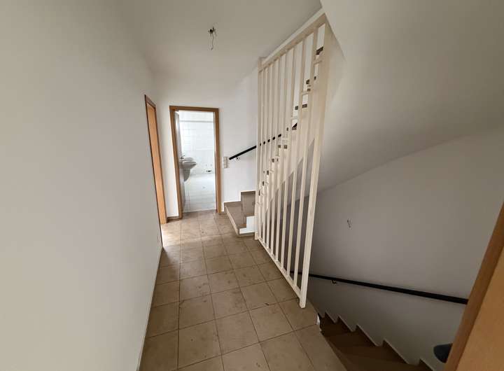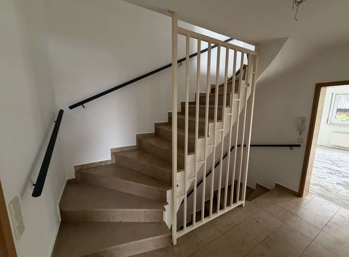Die Treppe ins DG ist ebenfalls gefliest und mit einem Geländer ausgestattet.