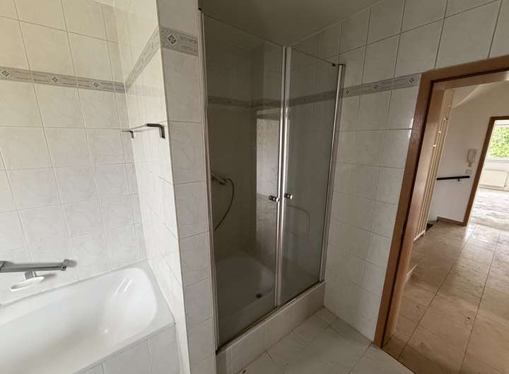 Der Flur im OG ist ebenfalls gefliest, das Bad im OG raumhoch.