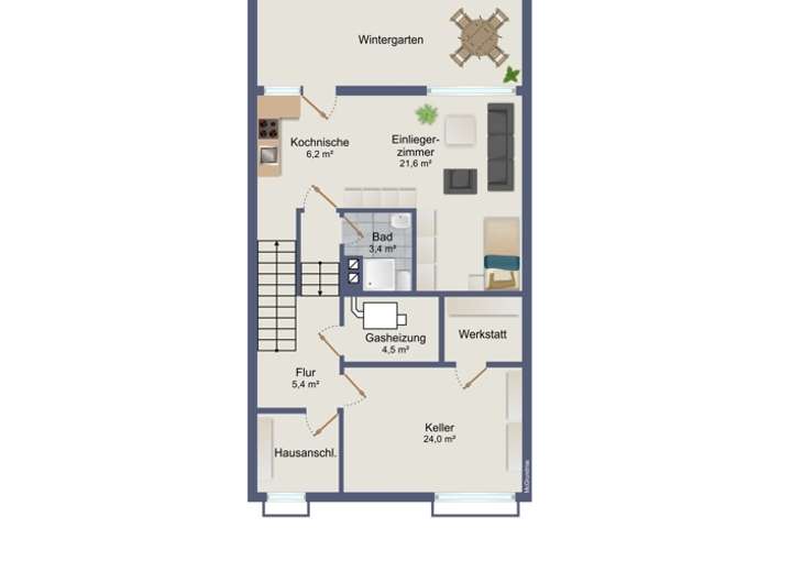 Ein weiteres Plus: Im Souterrain befindet sich eine komplett separat zugängliche Einliegerwohnung, die vielseitig nutzbar ist – sei es als Gästebereich, Homeoffice, Atelier oder zur Vermietung.