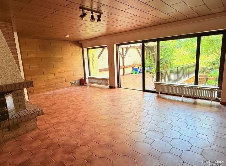 Das Herzstück des Hauses bildet das großzügige Wohnzimmer mit gemütlichem Kamin, der in den kühleren Monaten für eine behagliche Atmosphäre sorgt.