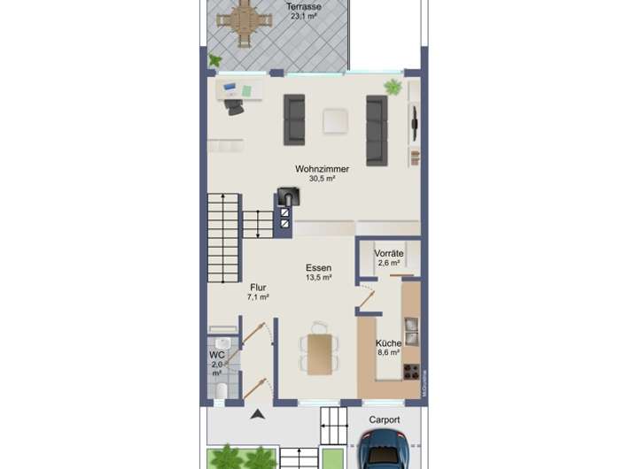Das absolute Highlight ist der charmante Lichthof, der als kleiner Wintergarten genutzt werden kann und für überraschend viel Tageslicht sowie eine besonders wohnliche Atmosphäre sorgt.