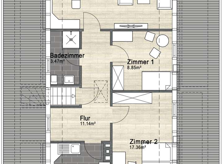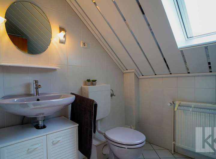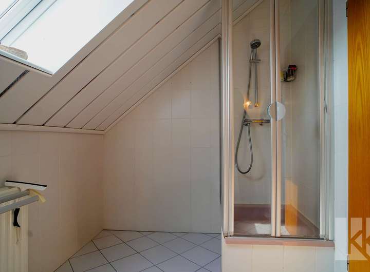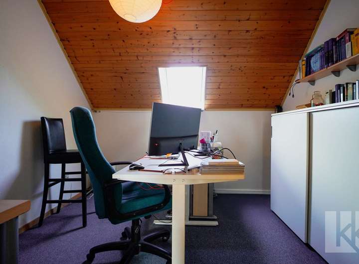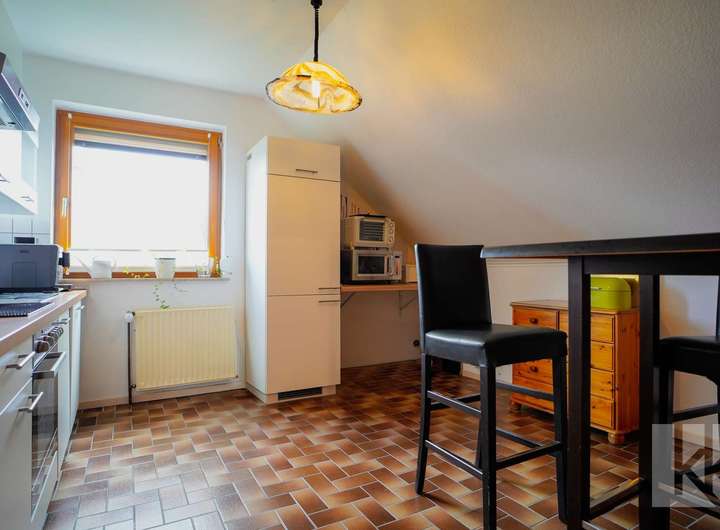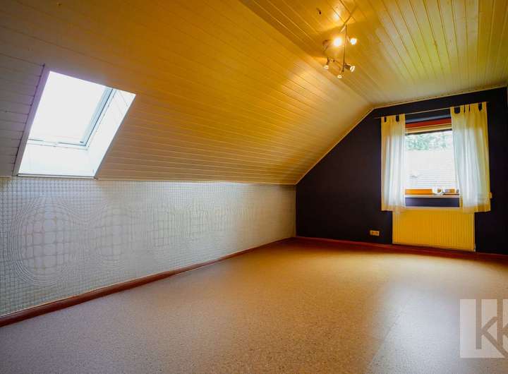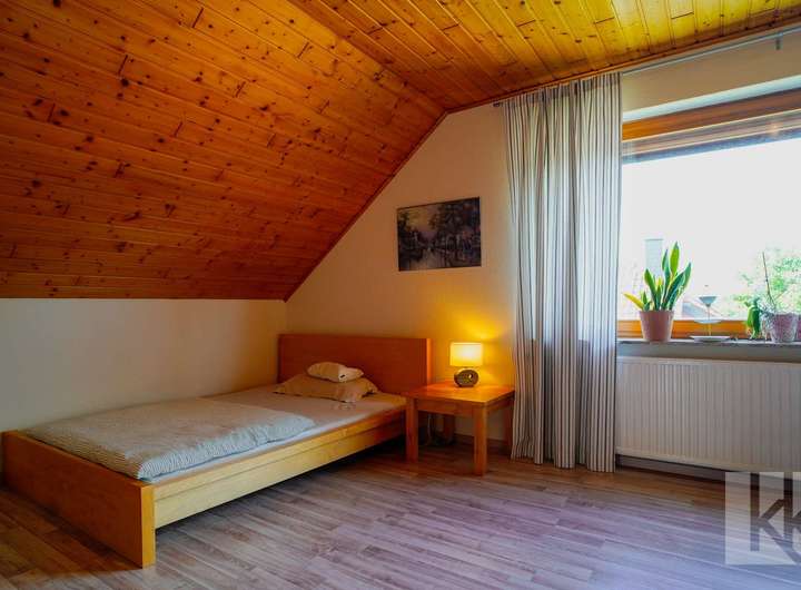 Das Obergeschoss verfügt über ein weiteres Badezimmer mit Dusche, ein kleineres Zimmer sowie ein großes Schlafzimmer. Zusätzlich erwartet Sie hier ein zweiter Wohnbereich mit angeschlossener Küche – perfekt als Rückzugsort, eigene Wohneinheit oder Raum für Gäste.