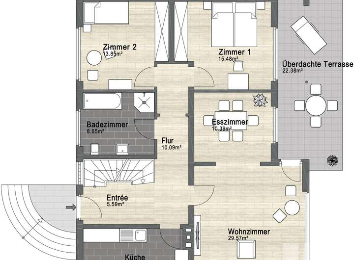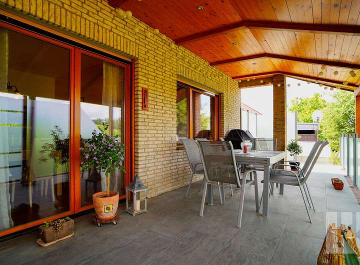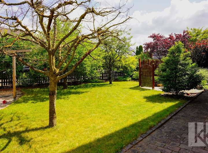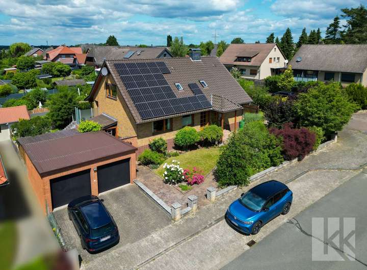 Draußen lädt eine große, überdachte Terrasse zum Verweilen ein. Der gepflegte Garten ist familienfreundlich und pflegeleicht – mit viel Platz zum Spielen, Entspannen oder Gärtnern. Ein geräumiges Gartenhaus bietet zusätzlichen Stauraum für Geräte, Möbel oder Hobbys. Für Fahrzeuge steht Ihnen eine großzügige Doppelgarage zur Verfügung.