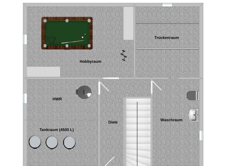 Das Untergeschoss umfasst einen Heizungsraum mit Öltanks (4.500 Liter), einen vielseitig nutzbaren Hobbyraum (auch als Schlafzimmer geeignet) sowie einen Wasch- und Trockenraum bzw. Abstellbereich.