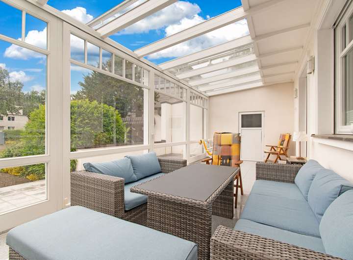 - Beheizter Wintergarten mit großen Schiebetüren und elektrischer Markise