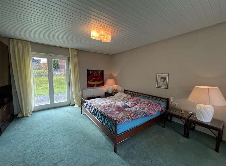 Die Böden sind mit Marmor ausgestattet; in den Wohn- und Schlafräumen sorgt Teppichboden für ein behagliches Ambiente. Die Küche ist großzügig gestaltet und bietet zusätzlich zum Esszimmer einen praktischen Essbereich. Der Schlaftrakt beherbergt das Hauptschlafzimmer, ein Kinderzimmer sowie zwei geschmackvolle Bäder. Große Fensterflächen sorgen in allen Räumen für viel Licht und einen herrlichen Blick ins Grüne.
