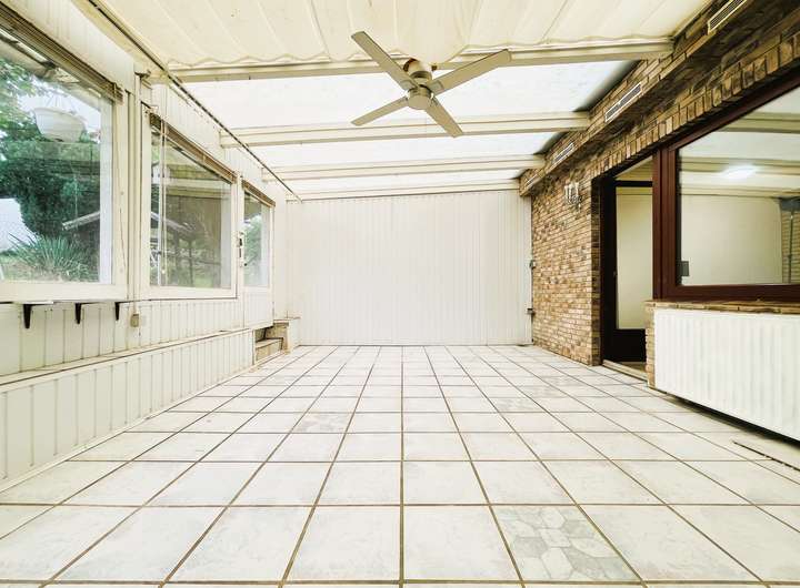 - Großer, gefliester Wintergarten mit Blick in den Garten
