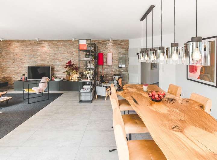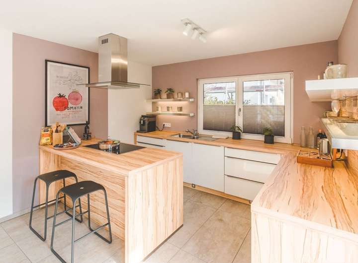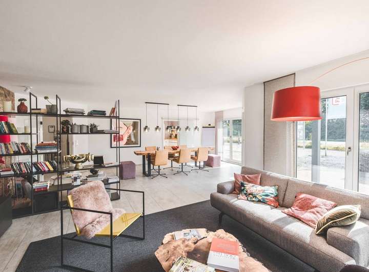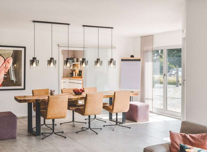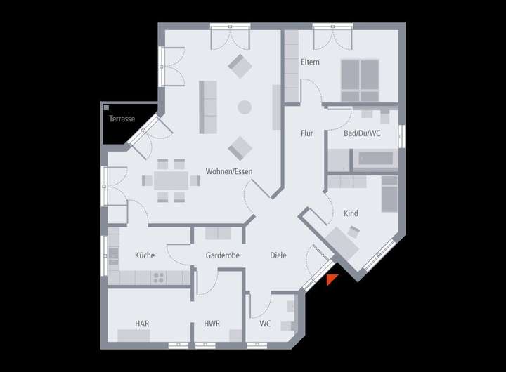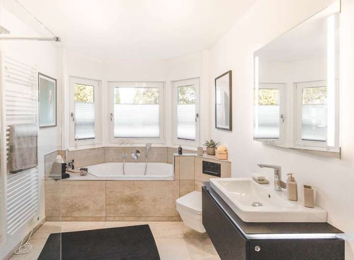 Wer das Außergewöhnliche sucht, der wird bei unserem Musterhaus Kaarst fündig. Schon auf die Distanz wird deutlich: Dieser Bungalow ist etwas ganz Besonderes. Und das liegt vor allem an der Grundrissgestaltung. Sechs Ecken sorgen unter dem zeitlos-eleganten Walmdach dafür, dass vor allem der mehr als 45 qm große Wohn-Ess-Bereich einen Schnitt erhält, der den Raum trotz der Größe gemütlich und einladend wirken lässt. Vier große Fensterfronten sorgen zudem dafür, dass jederzeit ausreichend Tageslicht einfällt. Von hier ist auch der Zugang zum Terrassenbereich möglich. Unmittelbar an den Essbereich schließt sich die kompakte Küche an. Praktisch: Von hier aus können über die Diele direkt ein Hauswirtschaftsraum und ein Hausarbeitsraum erreicht werden. Diese bieten ausreichend Raum zum Lagern von Lebensmitteln, für Waschmaschine, Trockner und Co. Ebenfalls direkt angegliedert: ein Gäste-WC. Auf der gegenüberliegenden Seite der großen Diele befinden sich die Räume zum Wohlfühlen und Entspannen. Dazu zählt neben einem Elternschlafzimmer und einem Kinderzimmer auch ein Bad mit Wanne, Dusche und WC.