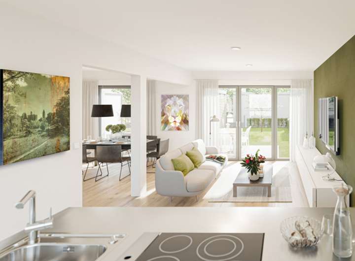 Im Inneren gibt die durchdachte Grundrissplanung auf drei Ebenen jedem Familienmitglied viel Raum für die individuelle Entfaltung. Großzügige Privatgärten mit Südterrassen sowie abgeschirmte Dachterrassen setzen das faszinierende Wohnerlebnis der eigenen "vier Wände" im Außenbereich fort – Freiheit pur!