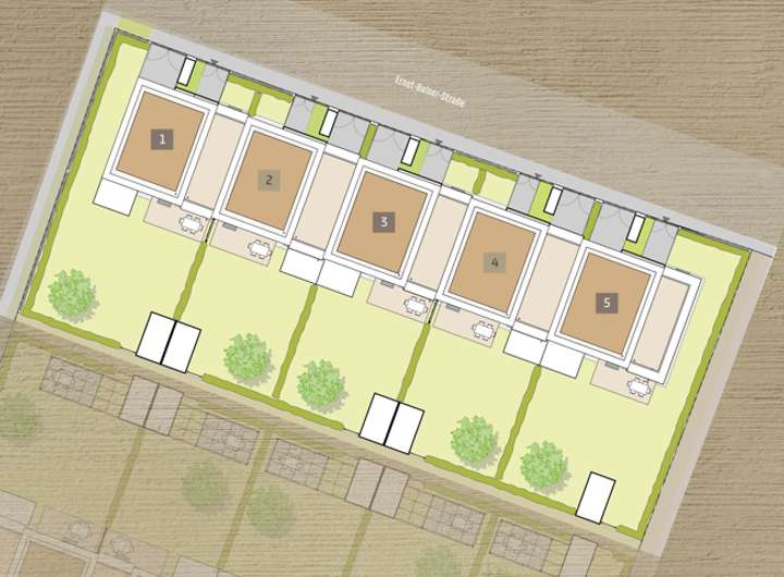 Die beiden Reihenhauszeilen aus jeweils fünf Eigenheimen bilden zusammen das Wohnkonzept »TOP 1O«. Das hier angebotene Haus gehört zur nördlichen Reihe der Eigenheime, die den ersten von zwei Bauabschnitten bildet.
