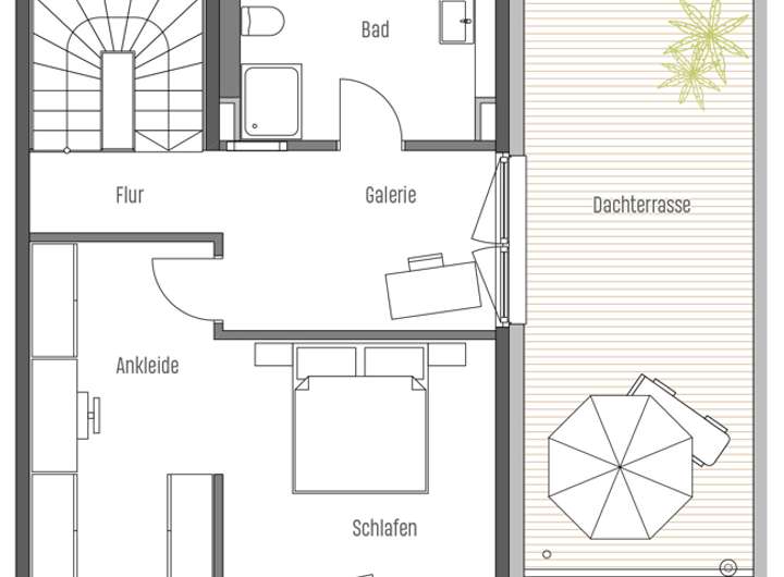 Im Dachgeschoss sind das einschließlich Ankleide rund 24 m² große Schlafzimmer sowie ein weiteres großzügiges Duschbad zu finden. Ergänzt wird diese Etage um eine private Dachterrasse mit ca. 24 m² Fläche.