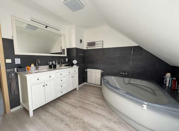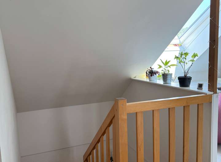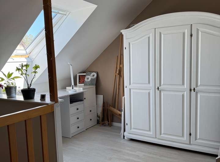 Das Obergeschoss verfügt über ein Schlafzimmer, ein Kinderzimmer, ein Tageslichtbad mit einer Eck-Badewanne. Eine gemütliche Galerie mit Dachfenster befindet sich im Dielenbereich und es besteht die Möglichkeit mit geringen Aufwand die Galerie in einem abgeschlossenen Wohnraum umzubauen. Das Obergeschoss wurde umfangreich modernisiert: Neue Fußbodenbeläge, neuer Wandanstrich, sowie neue Zimmertüren.