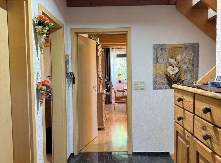 Im Untergeschoss befindet sich ein Heizraum, Waschküche, Vorratsraum und der Zugang zur Doppelgarage mit elektrischen Torantrieb.. Ein Werkstattbereich ist vorhanden. Weiterhin befinden sich vor der Garage drei Aussen-Stellplätze. Es besteht die Möglichkeit ein Wohnmobil zu platzieren.