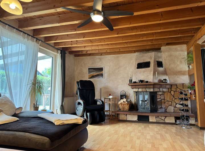 ein Büroraum. ein Wohnzimmer mit angrenzender Wohnküche und offenen Kamin. Eine Einbauküche inklusive Elektrogeräten runden das Kaufangebot ab.