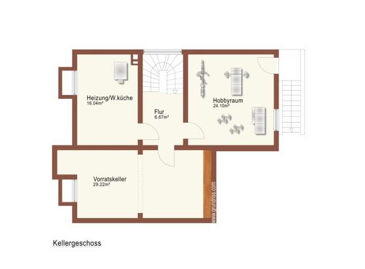 Im Untergeschoss befinden sich auf ca. 76 m² Fläche der Heizungsraum inkl. Waschmaschinenanschluss, ein Hobbyraum (ehemals Bar) mit praktischem Außenzugang sowie ein großer Lagerkeller.