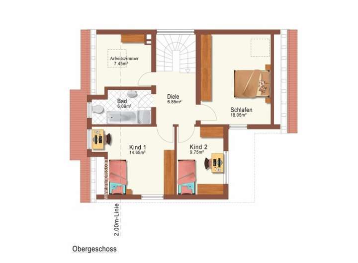 Dachgeschoss (ca. 63 m²): 4 Zimmer, Tageslichtbad mit Wanne und Dusche
