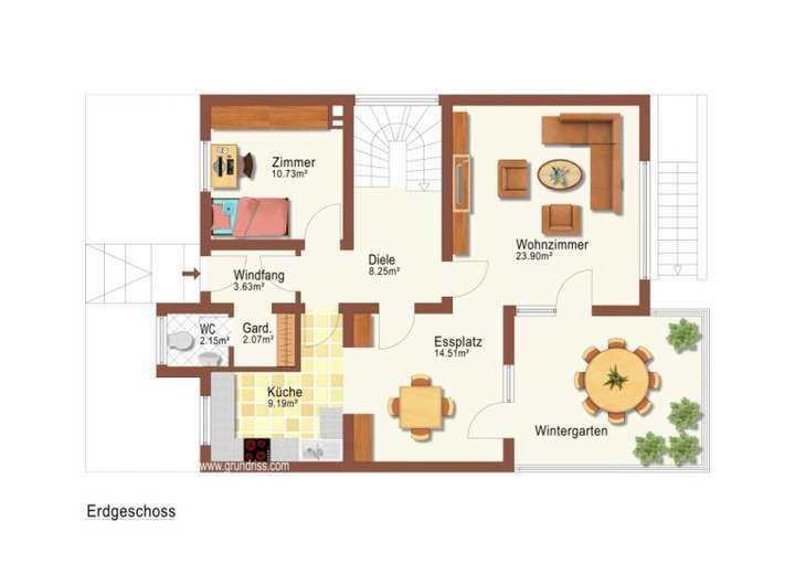 Erdgeschoss (ca. 83 m²): Diele, WC, verbundenes Wohn-/Esszimmer mit Heizkamin, Küche, separates Zimmer, Wintergarten