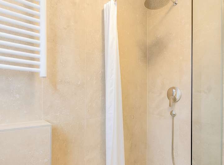Das Haus verfügt über drei Wohneinheiten im Erd-, Ober- und Dachgeschoss, die jeweils mit modernen Duschbädern ausgestattet sind. Die Bäder wurden mit hochwertigen Grohe-Armaturen sowie Sanitärobjekten von Villeroy & Boch versehen. Eine zusätzliche Dusche befindet sich im Saunabereich im Untergeschoss. Die Bäder im Erd- und Obergeschoss sind mit bodengleichen Duschen ausgestattet; im Dachgeschoss befindet sich eine klassische Dusche.