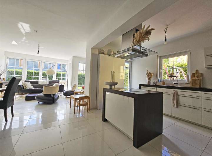 schönes Wohn- und Esszimmer mit Zugang zur sonnigen Terrasse, offene Küche,