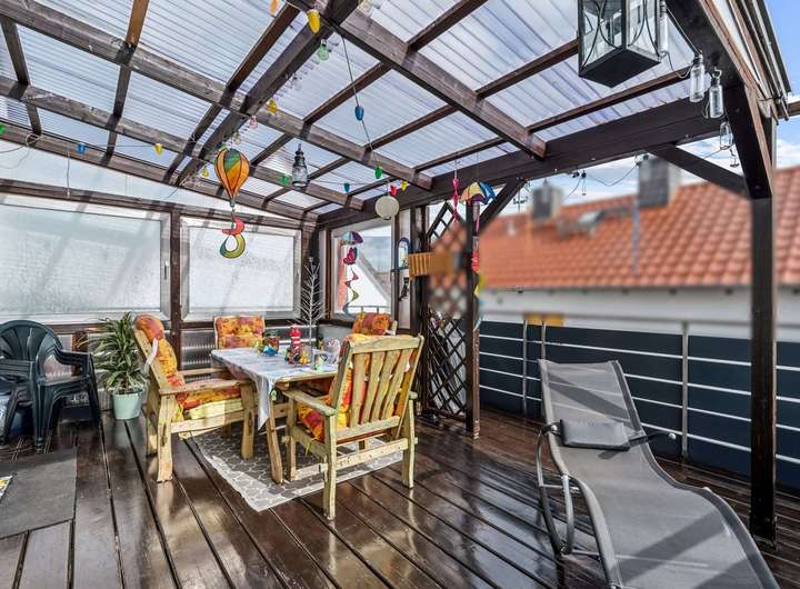 Die WE im Ober- und Dachgeschoss bietet Ihnen: einen Flur-/Dielenbereich, ein Bad mit Dusche, WC, Badewanne und zwei Waschbecken, ein separates Zimmer, ein Esszimmer mit offener Küche inkl. EBK und einen schönen großen überdachten Terrassenbereich über der Hofeinfahrt der Immobilie.