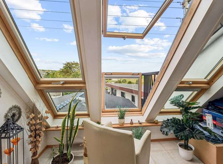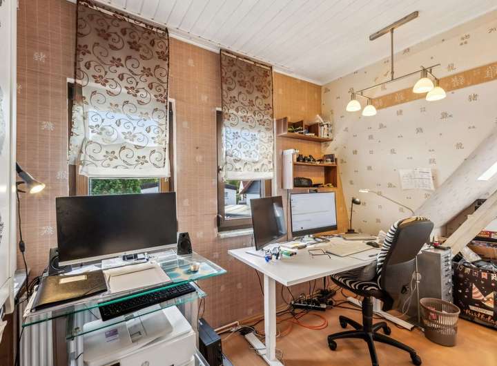 Hier bieten Ihnen drei separate Zimmer und ein Gäste-WC zusätzliche Wohn- und Nutzungsmöglichkeiten. Der Spitzboden ist durch eine offene Holztreppe erreichbar und bietet weitere Stau- und Abstellmöglichkeiten. Ein Highlight ist sicher die Glasfront, die großflächig geöffnet werden kann.