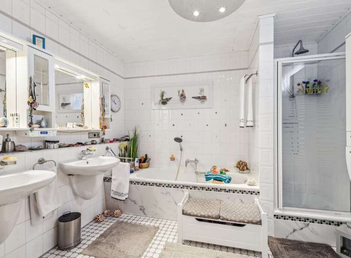 Die Böden sind mit Fliesen, Laminat oder Teppich belegt. Die Wände sind tapeziert oder verputzt und die Decken überwiegend mit Holz verkleidet.