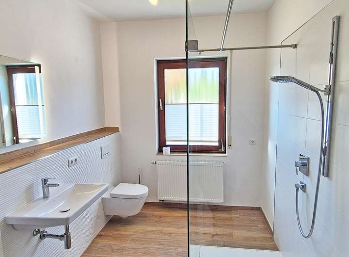 Einliegerwohnung (DG – ca. 75 m²) Die Dachgeschosswohnung bietet einen herrlichen Fernblick über die Umgebung und ist über einen separaten Zugang erreichbar. Die Wohnung gliedert sich wie folgt:-Windfang mit Abstellkammer-Großer Wohn- und Essbereich mit Erker und Kaminofen-Tageslichtbad mit Waschmaschinenanschluss Großzügiges Schlafzimmer