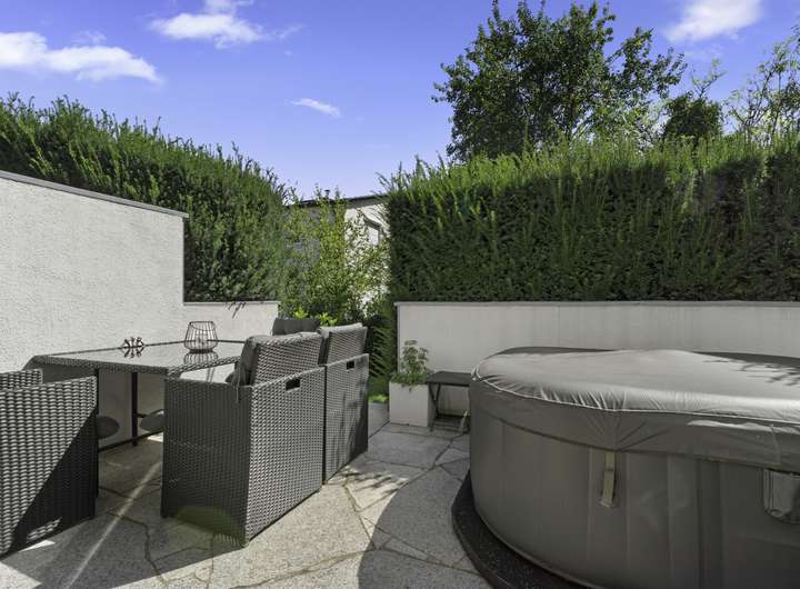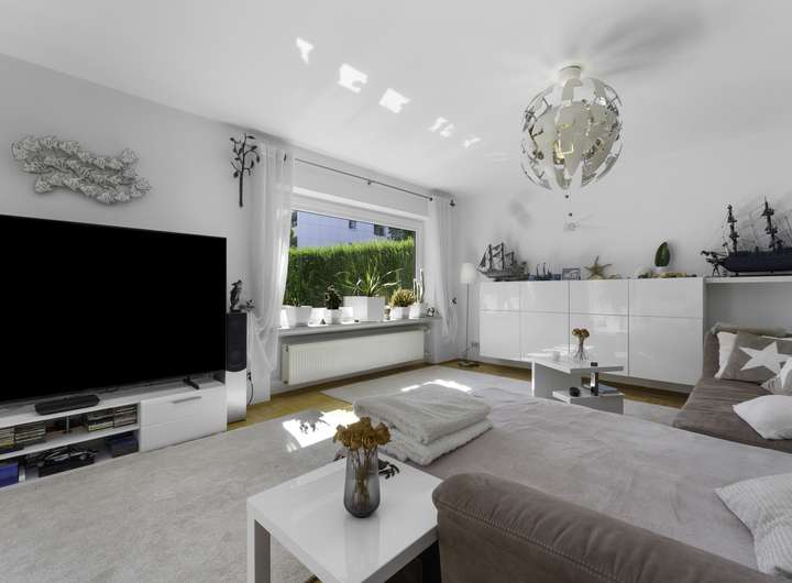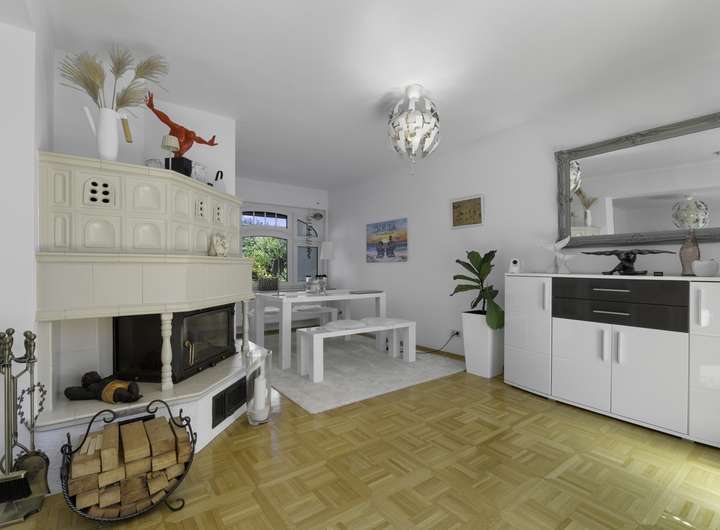Die Immobilie wurde 2023 modernisiert und präsentiert sich in einem zeitgemäßen, modernen Zustand. Das helle Wohnzimmer mit Kamin sorgt für eine angenehme Wohnatmosphäre, während eine hochwertige und stilvolle Einbauküche bereits inklusive ist.