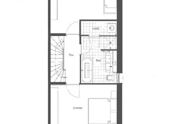Im Obergeschoss befinden sich zwei Schlafzimmer und ein modernes Badezimmer mit Badewanne und Dusche. Ein angrenzender Hauswirtschaftsraum sorgt für kurze Wege im Alltag.